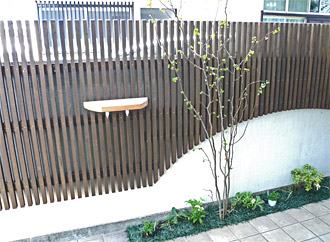 ルーバー木柵とエアコン室外機前の木柵