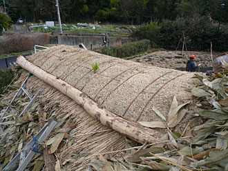遺跡公園竪穴式住居のてっぺんに庭造り